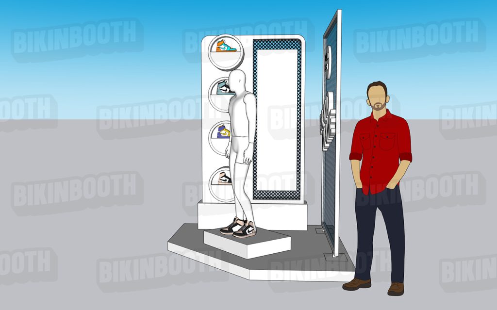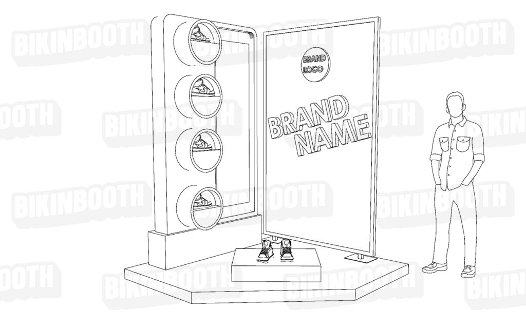 Instalasi booth ini dirancang khusus untuk menampilkan produk fashion, terutama sepatu atau apparel, dengan cara yang modern, estetik, dan sangat memukau. Kombinasi antara display rak lingkaran, manekin di atas podium, serta backdrop grafis besar membuat booth ini tampil seperti galeri brand premium yang siap menarik perhatian di setiap sudut event.