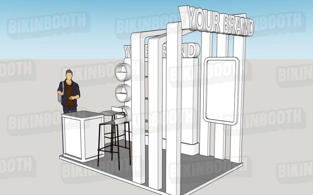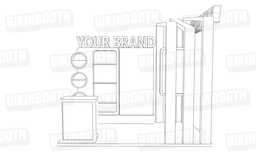 Pada bagian depan, terdapat area signage “YOUR BRAND” yang tampil menonjol sehingga nama brand mudah terlihat dari kejauhan. Booth ini juga dilengkapi meja resepsionis compact, rak display terbuka, serta kursi bar tinggi yang menciptakan area interaksi nyaman antara brand dan pengunjung. Struktur lengkung berlapis di sisi samping memberikan kesan arsitektural yang kuat sekaligus menghadirkan identitas visual elegan.