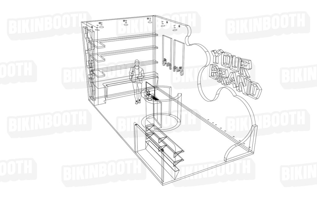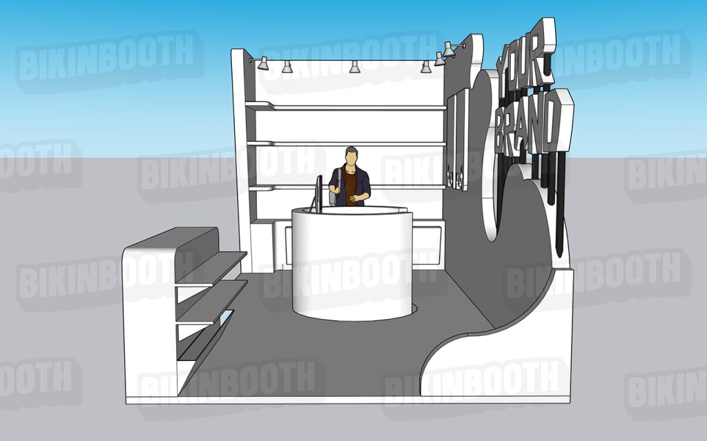 Pada sisi kanan, terdapat struktur latar artistik berbentuk gelombang dengan tulisan besar “YOUR BRAND,” menciptakan zona branding yang sangat kuat. Elemen ini akan langsung menarik perhatian pengunjung dan membuat booth terasa lebih ikonik dan mudah diingat.